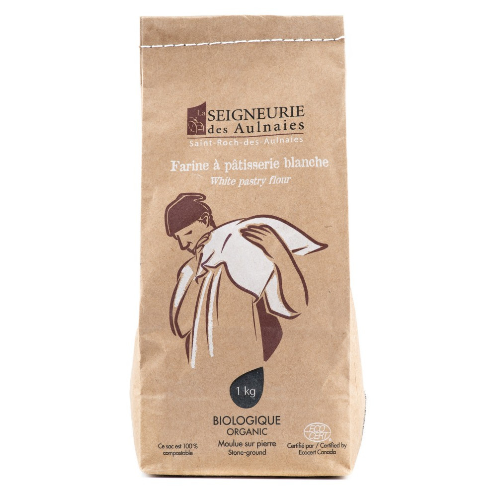 La Seigneurie des Aulnaies offre une gamme de farines fraichement moulues sur pierre. Notre farine à pâtisserie blanche bio est faite de blé mou, soit un grain qui contient beaucoup d’amidon et très peu de gluten. Elle donne une pâte beaucoup plus légère que la farine tout usage.